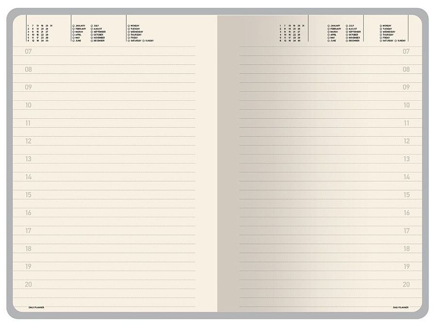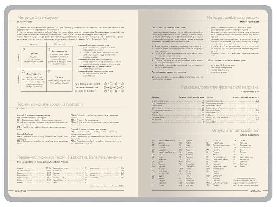 Недатированные страницы в серую линейку имеют отдельное место для проставления числа месяца и дня недели. Справочный блок на 17 страницах содержит полезную информацию из различных областей.