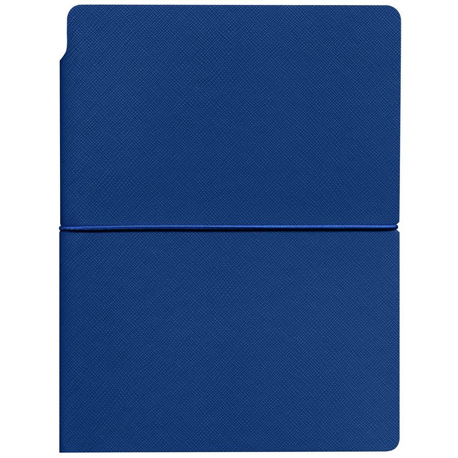 Ежедневник с гибкой обложкой выполнена из материала Nice Touch, синий и Latte, синий (внутренняя часть обложки), дополнен горизонтальной резинкой в цвет обложки. Внутри корешка — специальное место для крепления ручки размером до 15х1 см.