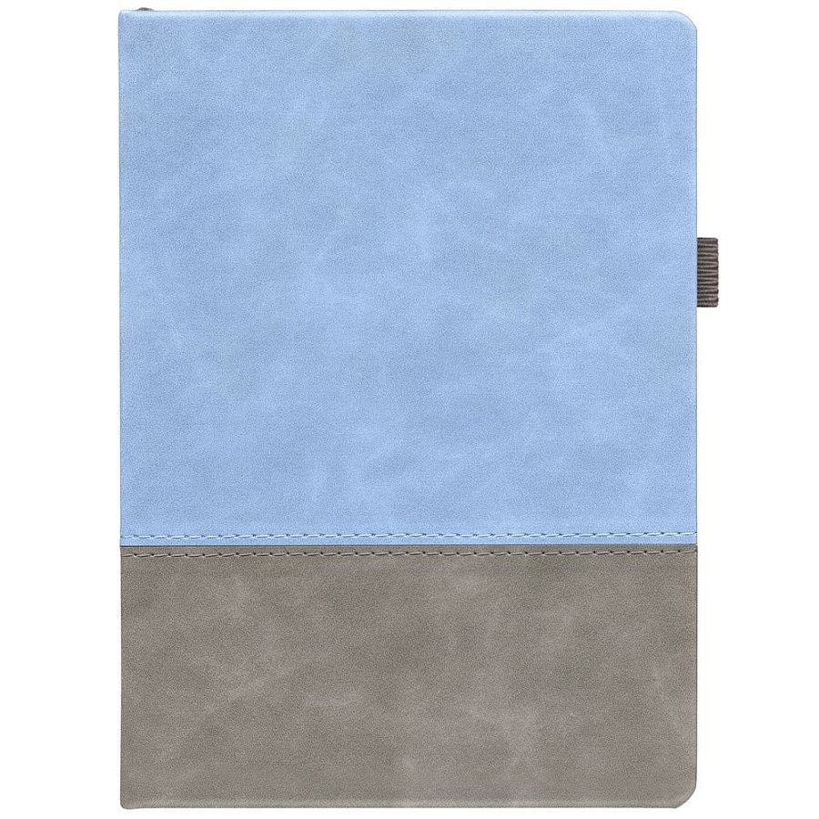 Ежедневник с твердой обложкой, без поролона, со сшивкой материалов Nubuck Touch, серый СС, и Nubuck Touch голубой JJ, дополнен двойным ляссе и петлей-резинкой для ручки.