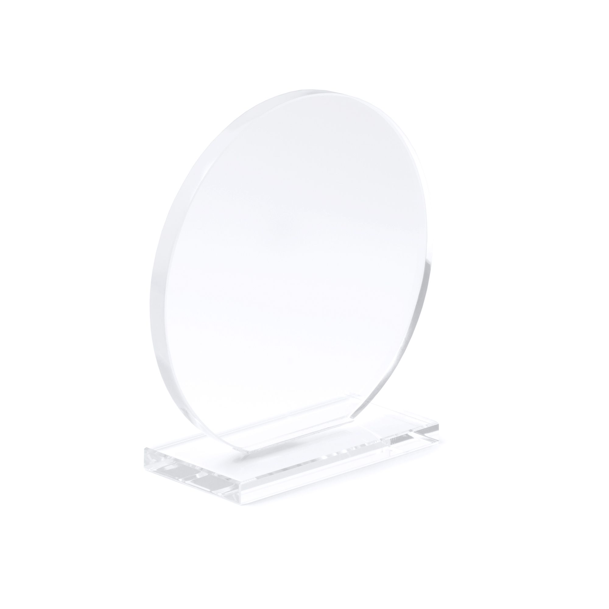 Стеклянная награда круглой формы с прямоугольным основанием. Включает черный презентационный футляр.