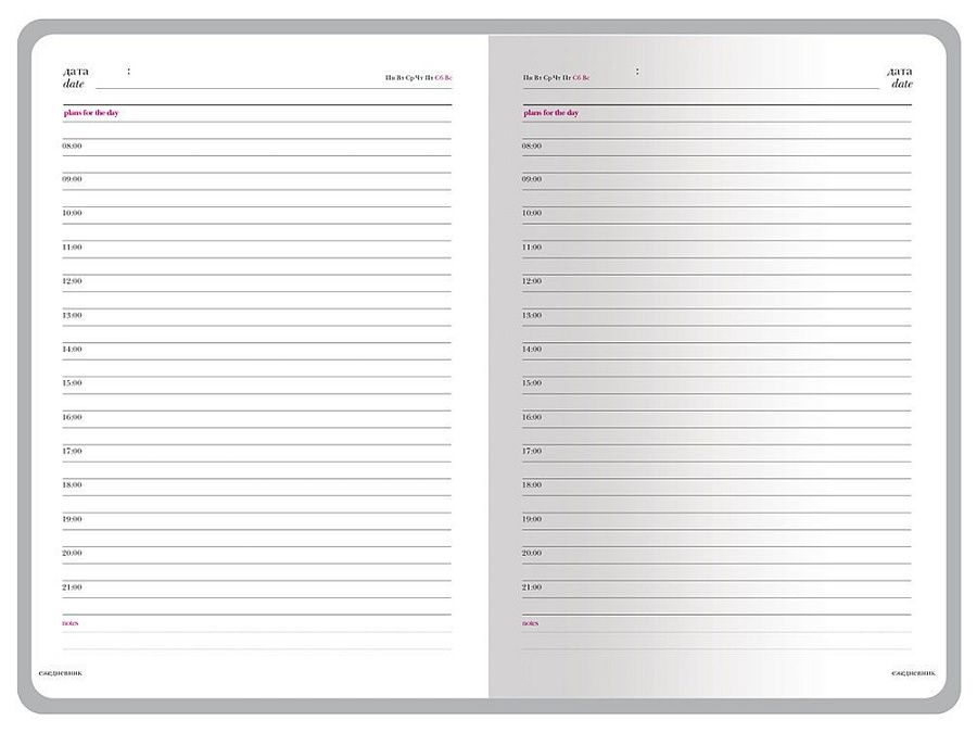 Недатированные страницы в серую линейку имеют отдельное место для проставления числа месяца и дня недели. Справочный блок на 17 страницах содержит полезную информацию из различных областей.