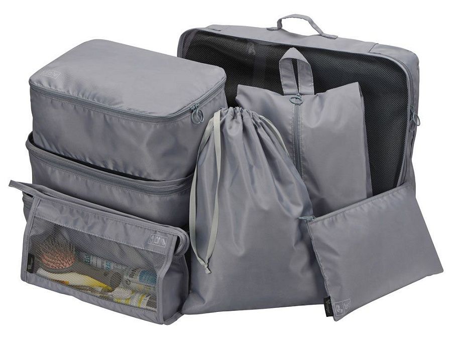 Чехлы — самых разных форм и размеров, предназначенные для разнообразного содержимого: одежды, обуви, косметики и гигиенических принадлежностей. Чехлы выполнены в виде мешков на кулиске, сумок на молнии, косметичек, некоторые из них оснащены сеткой для циркуляции воздуха и доступного просмотра содержимого, а также ручками для переноски и подвешивания. Иконки на чехлах подскажут, для чего предназначен каждый из них.
