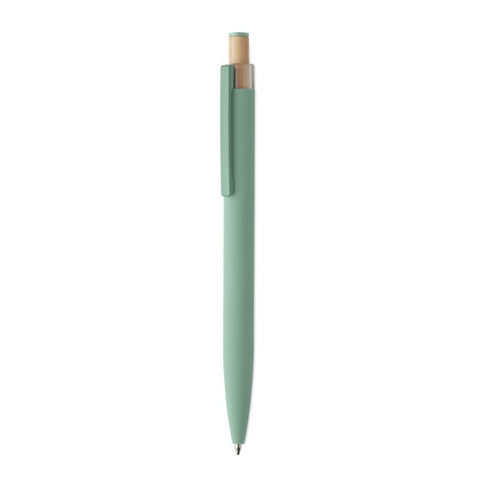 Шариковая ручка из переработанного алюминия с кнопкой из бамбука с цветными деталями и металлическим клипом. Синие чернила.