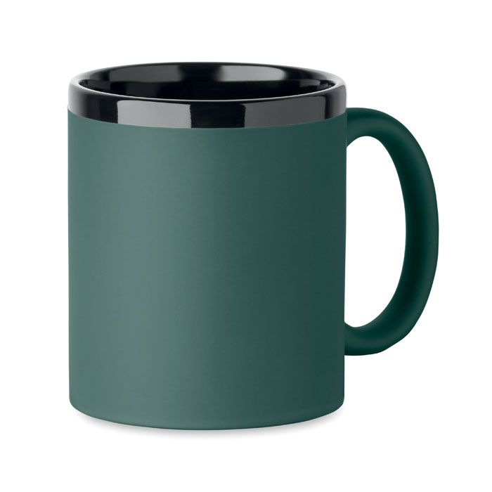 Керамическая кружка с покрытием soft touch, черной внутренней частью и ободком. Подходит для гравировки. Емкость: 300 мл. Упакована в белую картонную коробку.