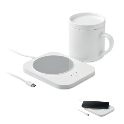 2 в 1: беспроводное зарядное устройство 15 Вт и подогреватель для кружки из пластика. В комплекте керамическая кружка с крышкой. Емкость: 250 мл. Поддерживает температуру напитков до 50ºC. 3 температурных режима с сенсорным экраном. Кабель USB. Выход: DC 9 В/1,67 А (15 Вт).