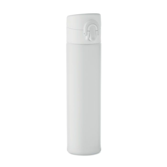 Термобутылка с двойными стенками из переработанной нержавеющей стали 90% и 10% нержавеющей стали с замком от проливания на крышке и опцией нажатия для открытия. Герметичная. Емкость: 300 мл.