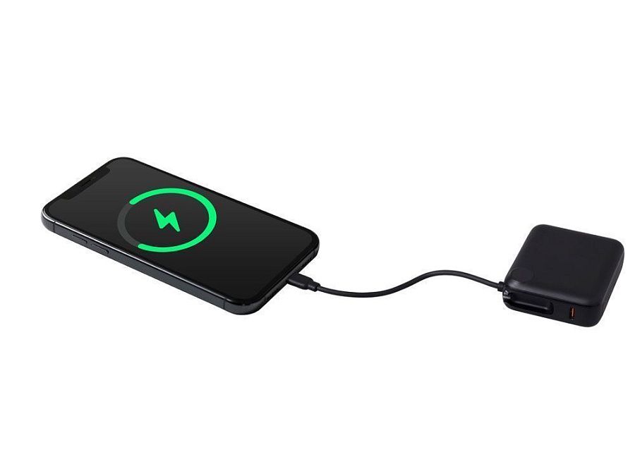 - Встроенный двунаправленный кабель-петелька USB-C — всегда под рукой! Заряжает смартфоны по USB-C (в т.ч. новые iPhone), а также заряжается сам по встроенному кабелю.