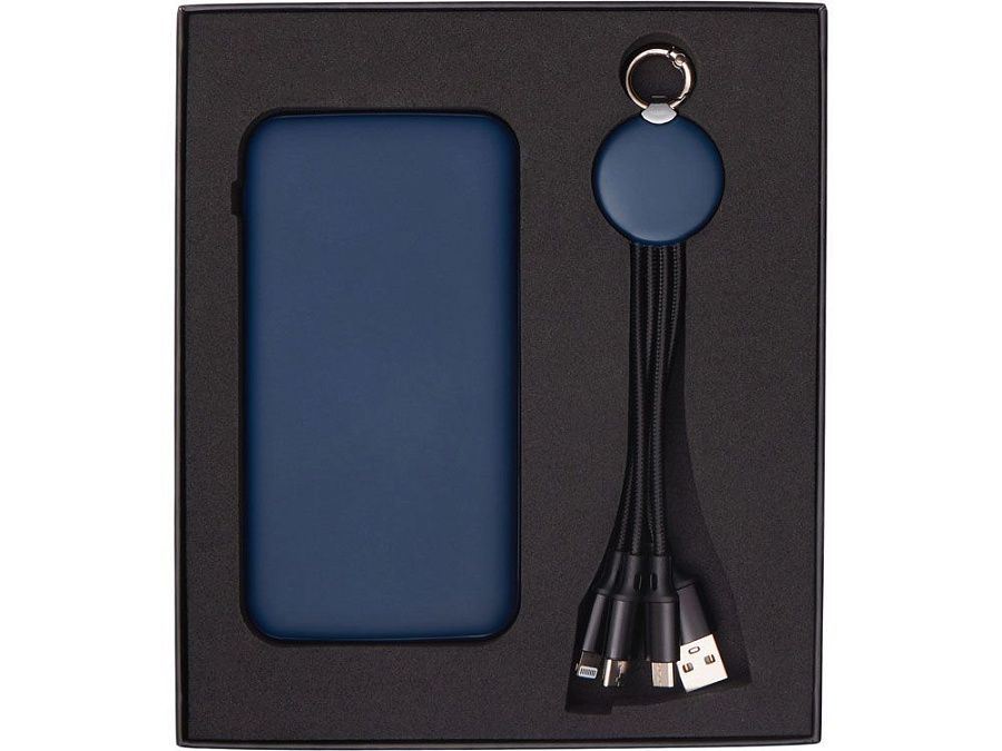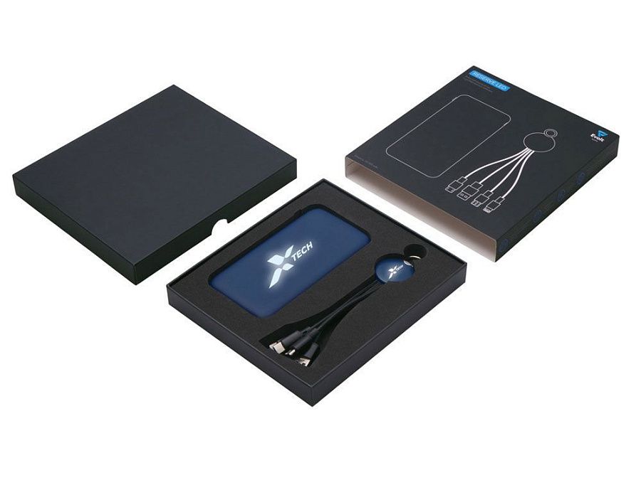 Практичный и стильный набор для зарядки в дороге: внешний аккумулятор на 10 000 мА·ч и универсальный кабель с тремя разъёмами (Micro USB, Lightning, USB Type-C). Оба элемента комплекта оснащены подсветкой логотипа — ваш бренд всегда на виду, даже в темноте. Повербанк обеспечивает 2–3 полных заряда смартфона и оснащён двумя выходами (USB-A и USB-C) для одновременной зарядки двух устройств. Поставляется в прочной подарочной коробке с шубером — идеальное решение для корпоративных подарков.