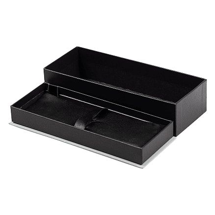 · Футляр для одной или двух ручек, бумажный, черный с серебристым элементом. Основа изготовлена из плотного высококачественного картона, вкладыш футляра имеет гладкую, приятную на ощупь текстуру. Пишущий инструмент закрепляется с помощью резинки. Футляр подходит для одной или двух ручек, так же подходит для механического карандаша. Максимальная длина вложения - до 16,5 см.