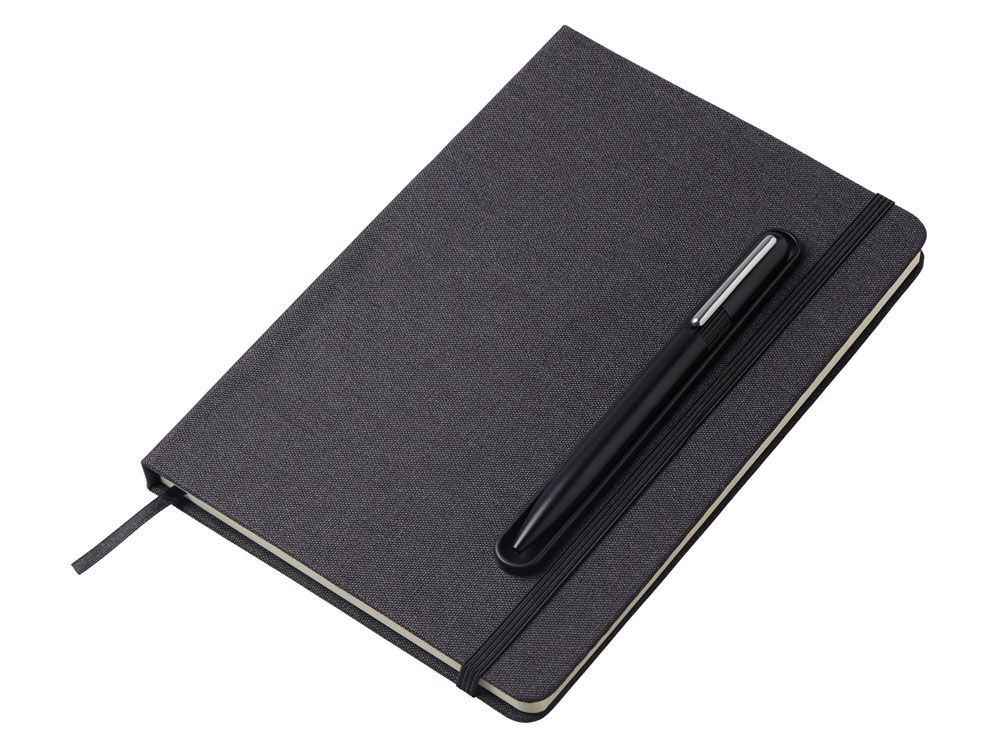 Блокнот в твердой обложке из rpet-пластика с металлической шариковой ручкой. В обложке магнитный держатель для ручки. Также верхняя часть обложки трансформируется в подставку для телефона.