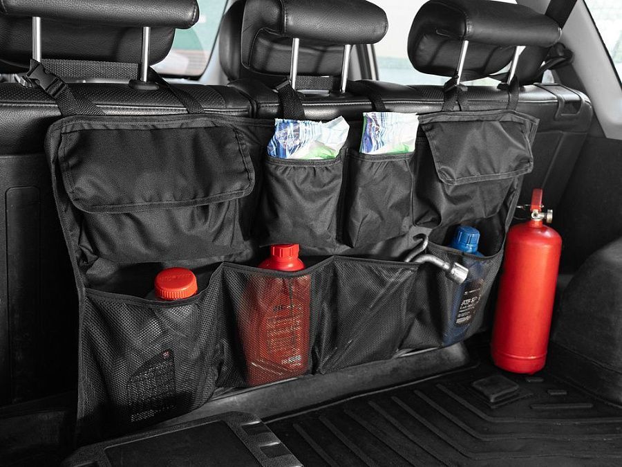 В органайзере имеются разные по форме и типу карманы: карманы-сетки, карманы с крышкой на липучке и открытые карманы. Конструкция крепится ремнями за подголовники задних сидений. Дополнительно на его задней части имеются ленты-липучки, которые обеспечивают полное прилегание к спинкам задних кресел.