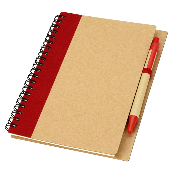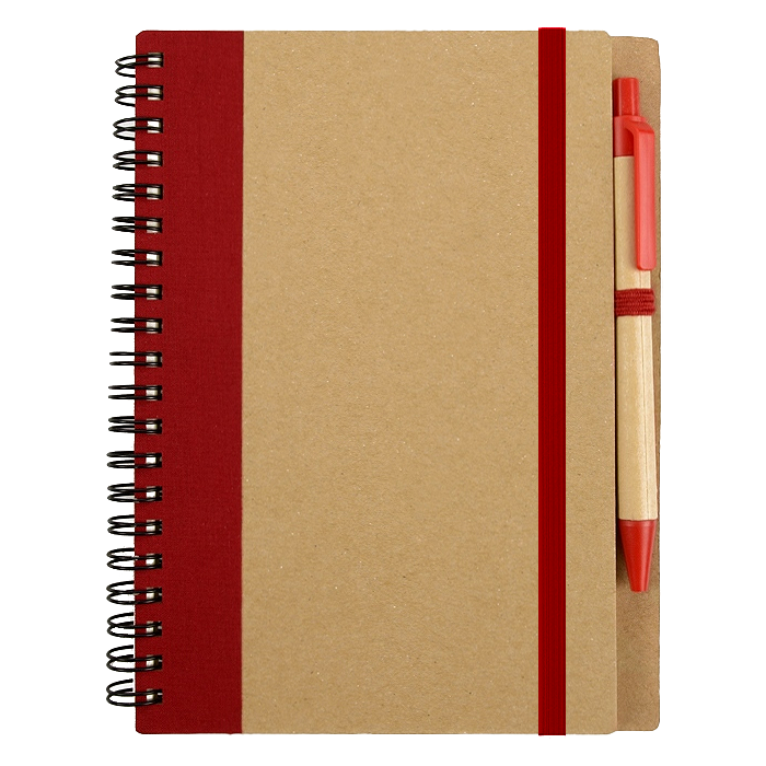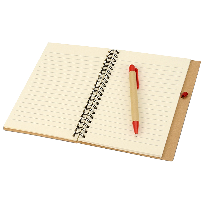 Спиральный блокнот в твёрдой крафтовой обложке с вертикальной тканевой вставкой. Оснащён ручкой в тон, закреплённой на боковой петле — всегда под рукой для быстрых заметок.
