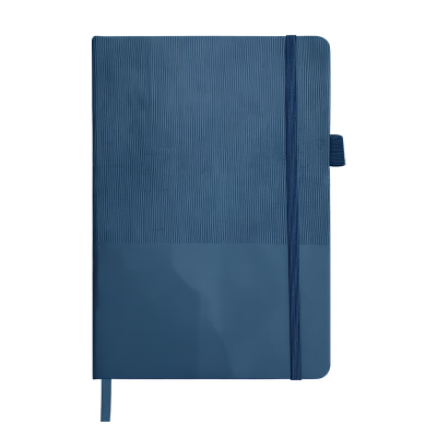 Стильный блокнот в твёрдой обложке с текстурированной верхней частью и гладким нижним сегментом. Оснащён вертикальной резинкой для фиксации и петлёй для ручки — всё под рукой.
