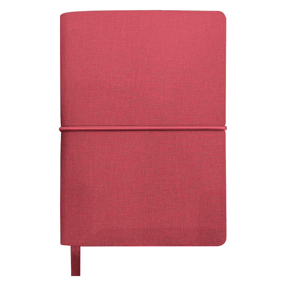 Гибкая обложка с текстурой ткани, горизонтальная резинка-фиксатор и закладка-лента. Внутри — страницы в линейку и набор цветных стикеров для заметок, маркировки и планирования.