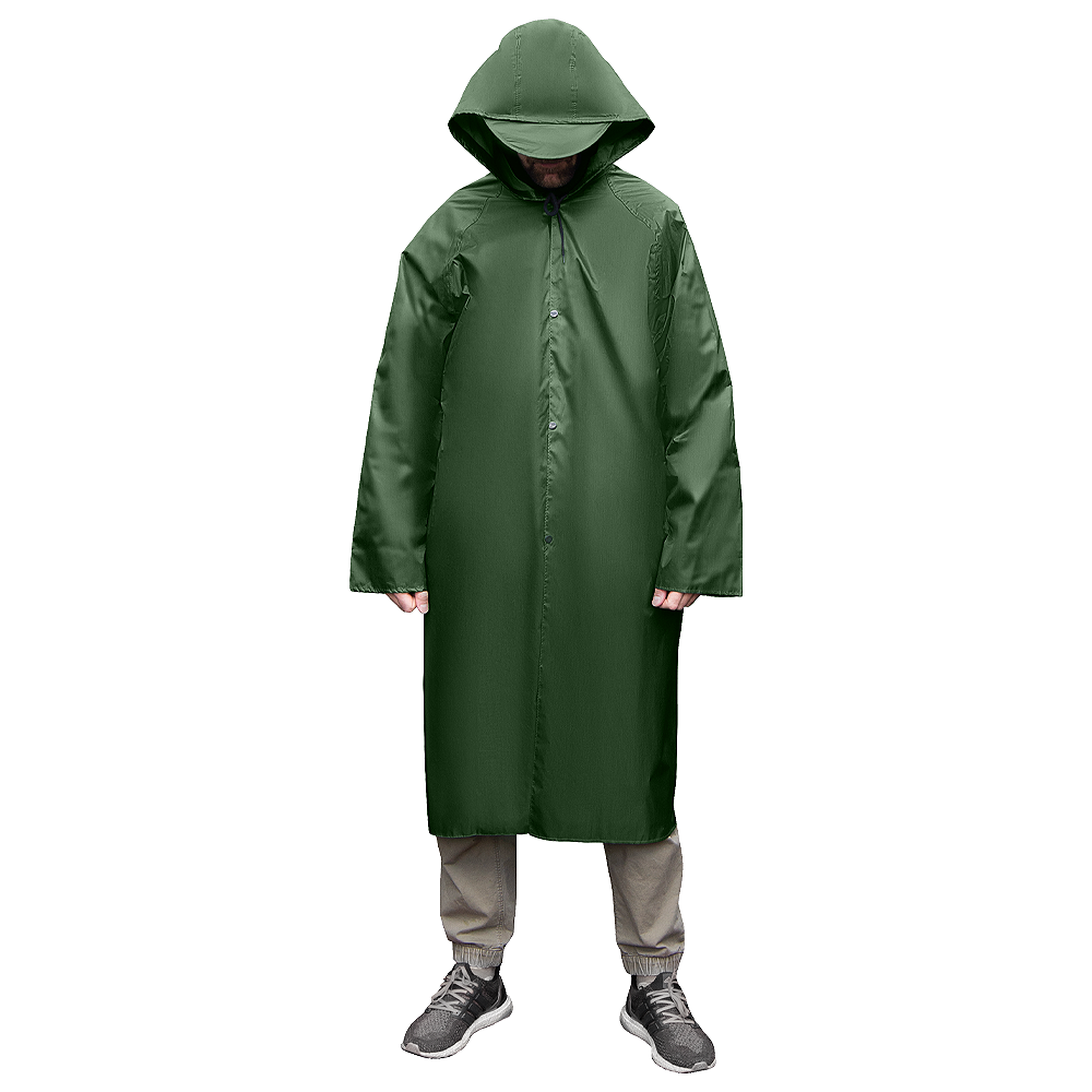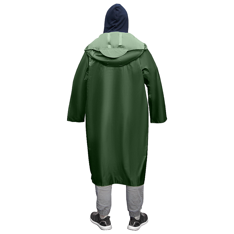Унисекс-модель из плотного полиэстера с водоотталкивающей пропиткой. Длинный крой до колена, капюшон с утягивающими шнурами и застёжка на кнопках обеспечивают комфорт и надёжную защиту в дождливую погоду. Свободный силуэт не сковывает движения, подходит для мужчин и женщин.