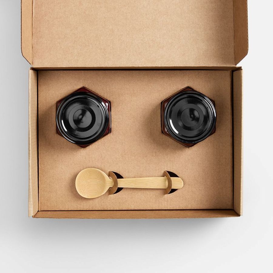 коробка - микрогофрокартон; баночки - стекло, жесть; ложка - бамбук