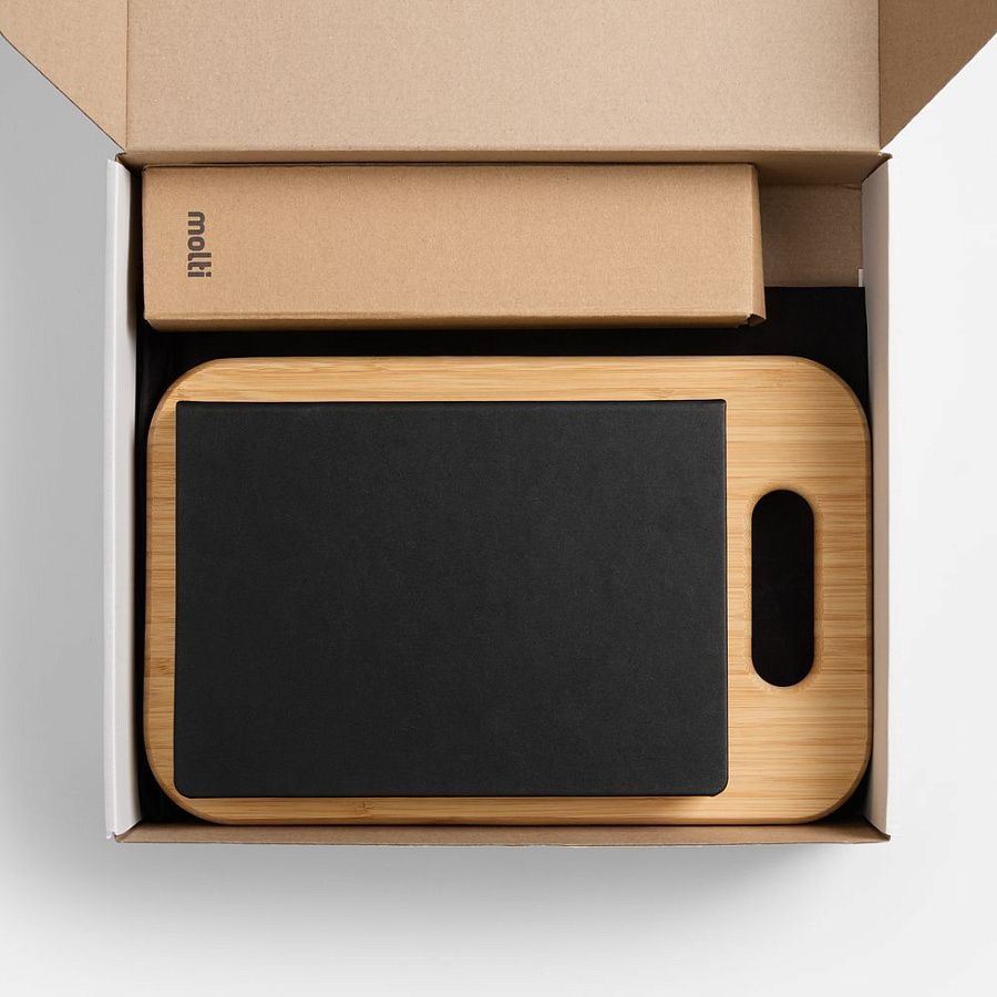 мельница - нержавеющая сталь; пластик; фартук - хлопок 100%, плотность 240 г/м²; ежедневник - покрытие софт-тач; доска - бамбук; коробка - микрогофрокартон, Т-23Е