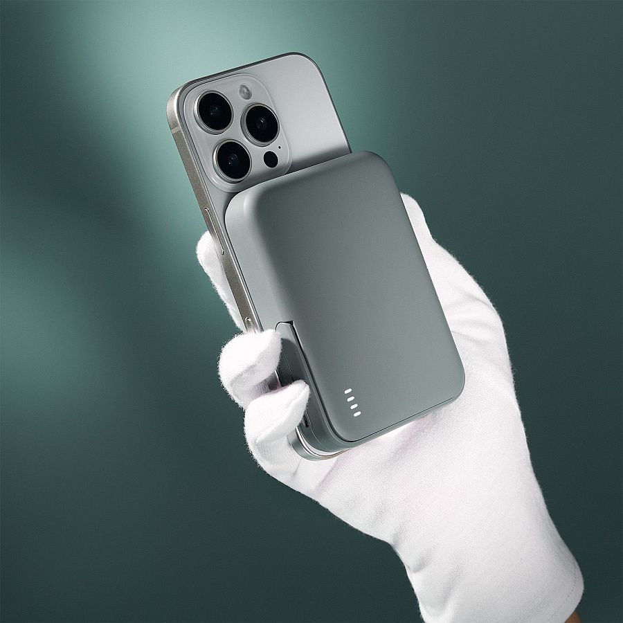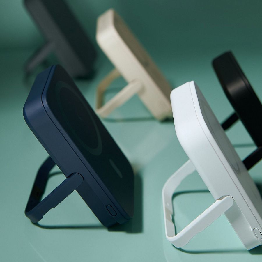 Мощное магнитное кольцо MagSafe обеспечит надежную фиксацию телефона как в вертикальном, так и горизонтальном положении, гарантируя стабильный контакт и эффективную передачу энергии. Удобная встроенная подставка позволяет удобно расположить телефон на рабочем столе. Эргономичный дизайн аккумулятора дополнен приятным на ощупь покрытием Soft Touch.