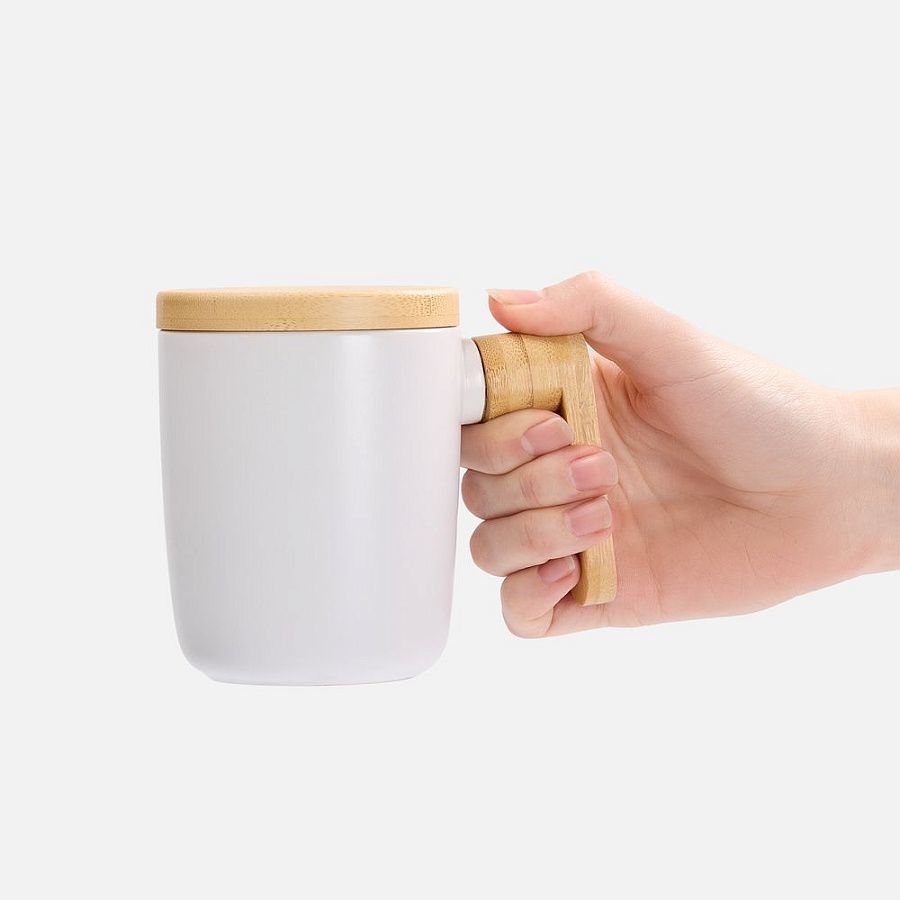 Стильная кружка с крышкой и ручкой из бамбука станет самой любимой на полке! Это идеальный компаньон для продуктивного диалога или умиротворяющего уединения.