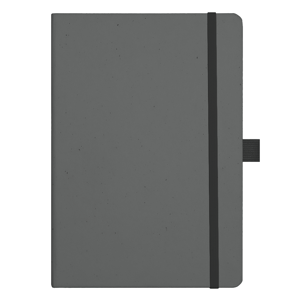 Твердая обложка выполнена из переработанной бумаги с характерной фактурой: матовая, слегка шероховатая поверхность с едва заметными вкраплениями волокон создает ощущение натуральности и тепла, напоминая ручную бумагу премиум-класса. Такой материал не только подчеркивает заботу об окружающей среде, но и придает блокноту уникальный винтажный шарм.