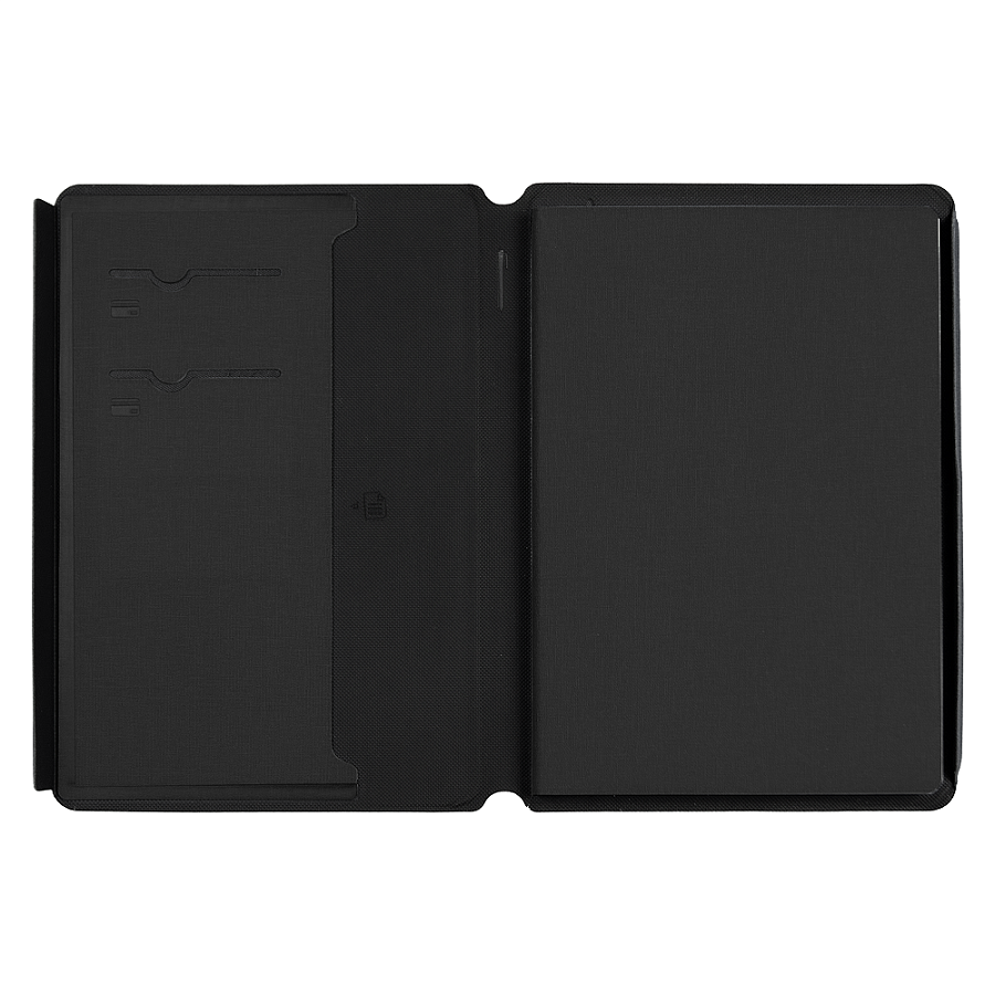 Суперобложка оснащена интегрированными карманами для карт и заметок.