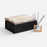 флакон - стекло, палочки из файбера; подставка для флакона - дерево; плед - хлопок 95%, полиэстер 5%, плотность 300 г/м²; коробка - переплетный картон, бумага malmero