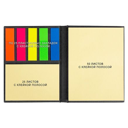 - Клейкие пластиковые закладки в 5 цветах по 25 штук (размер: 46 × 12 мм) помогут выделить важные моменты в записях.
