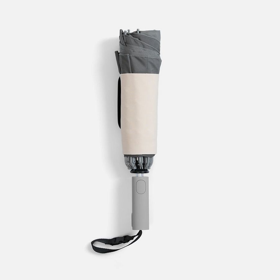 Складываясь после дождя, он прячет мокрую поверхность внутри, а сухая остается снаружи: в закрытом положении зонт не побеспокоит окружающих и не намочит одежду. Благодаря застежке на ремешке зонт удобно подвесить, например, на рюкзак.
