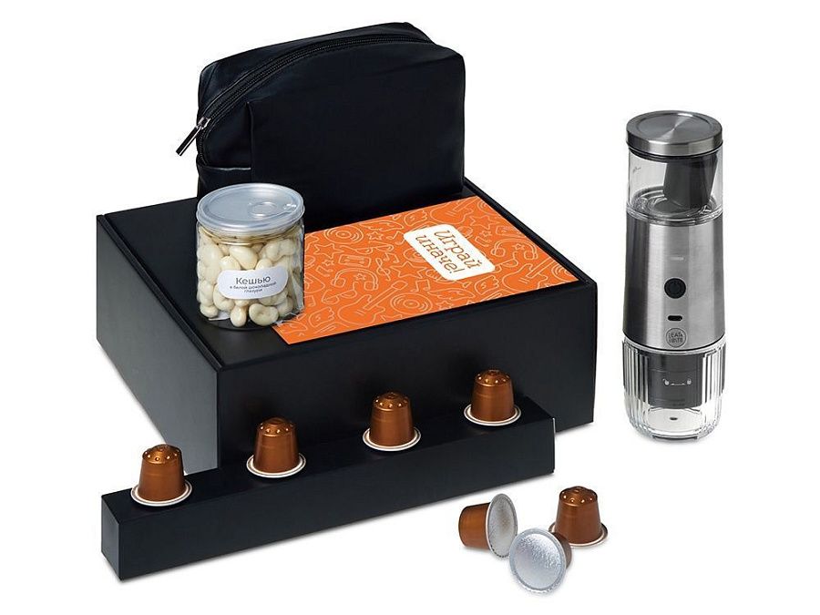 Набор "Re:y. Boost" о бодрости, энергии и маленьких ритуалах, которые можно взять с собой. Портативная кофемашина и кофе в капсулах позволяют приготовить ароматный напиток дома, в офисе или на прогулке. Кешью в глазури добавляет сладкую нотку, а косметичка позволяет взять любимые вещи с собой, куда бы вы ни отправились.. Этот набор превращает привычный утренний ритуал в момент бодрости и комфорта, где бы вы ни были.
