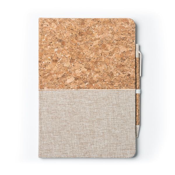 Блокнот А5 в твёрдом переплёте из пробки и хлопка. 80 нелинованных листов. В комплект входит ручка из пробки и пшеничного волокна в соответствующем держателе для ручки. Синие чернила.