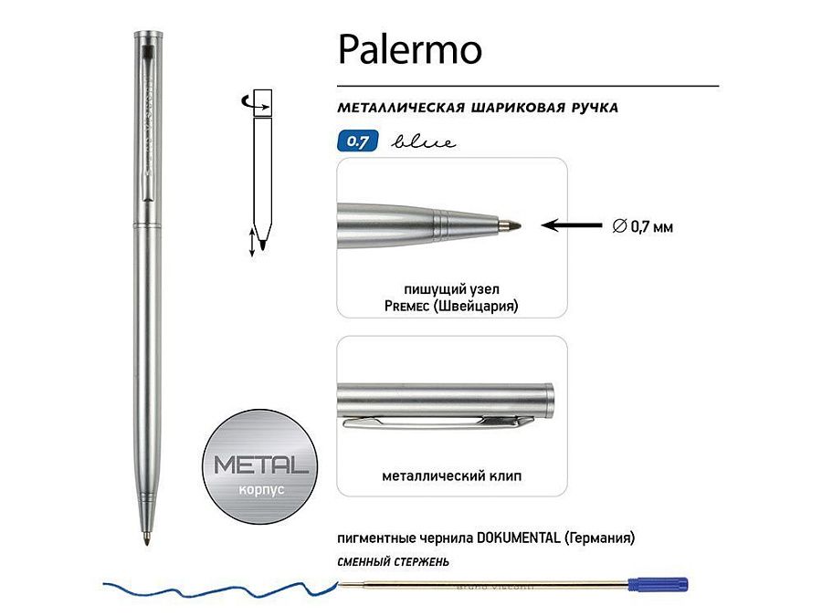 Автоматическая металлическая ручка "Bruno Visconti" серии "Palermo" однотонного цвета порадует любителей всего изящного и утонченного. Стержень легко выдвигается благодаря поворотному механизму. Синие пигментные чернила Dokumental (Германия) и пишущий узел Premec (Швейцария) обеспечивают качественное и мягкое письмо.