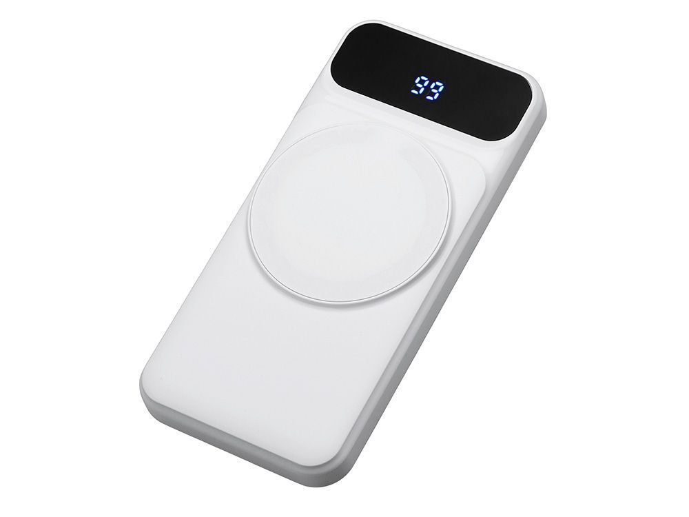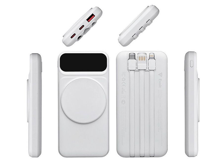 Функциональный и удобный внешний аккумулятор на 10 000 мАч обеспечивает быструю зарядку как по кабелям, так и беспроводным способом, поддерживая современные стандарты скорости. Цифровой дисплей на верхней панели мгновенно показывает точный уровень заряда, а встроенные кабели Lightning, USB-C и входной USB-A устраняют необходимость в дополнительных проводах — всё, что нужно для каждодневного использования, уже есть в самом гаджете. Компактные габариты, сопоставимые с размером смартфона, делают устройство идеальным для путешествий и повседневного использования. Сильные магниты гарантируют надёжное крепление при беспроводной зарядке. В комплекте есть силиконовая накладка: перед использованием удалите защитный стикер и прикрепите её к корпусу.