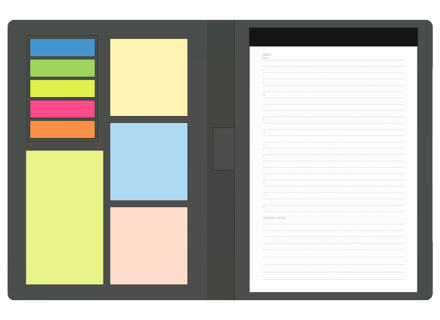 Внутри вы найдете: блокнот из 70 страниц, стикеры, а также петлю для ручки.