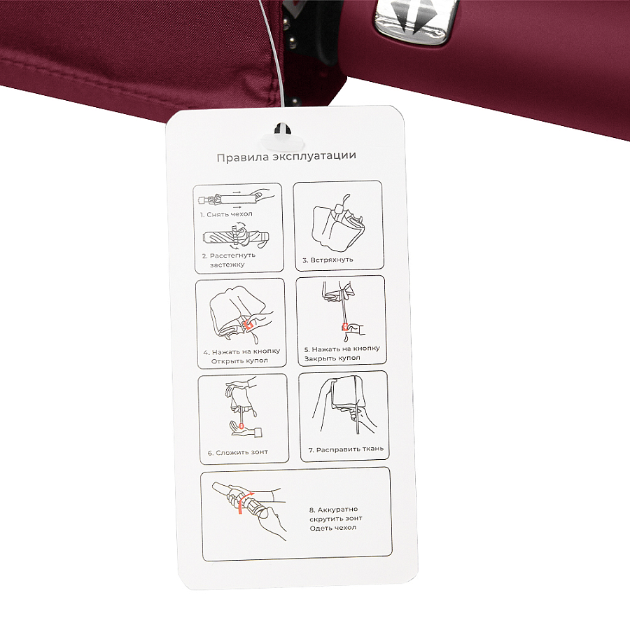 Чехол зонта выполнен из того, же материала, что и купол зонта, внутри и снаружи, имеет уплотнение и большое отверстие, что позволяет удобно упаковать зонт после использования. Чехол закрывается на магнитную кнопку серебристого цвета.