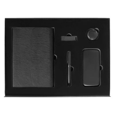Элегантная упаковка с магнитным клапаном скрывает внутри изысканную композицию аксессуаров, идеально подходящих для деловой среды и повседневного использования. Два цветовых решения — глубокий черный и благородный синий — позволяют выбрать настроение подарка: от строгой классики до утончённой индивидуальности.