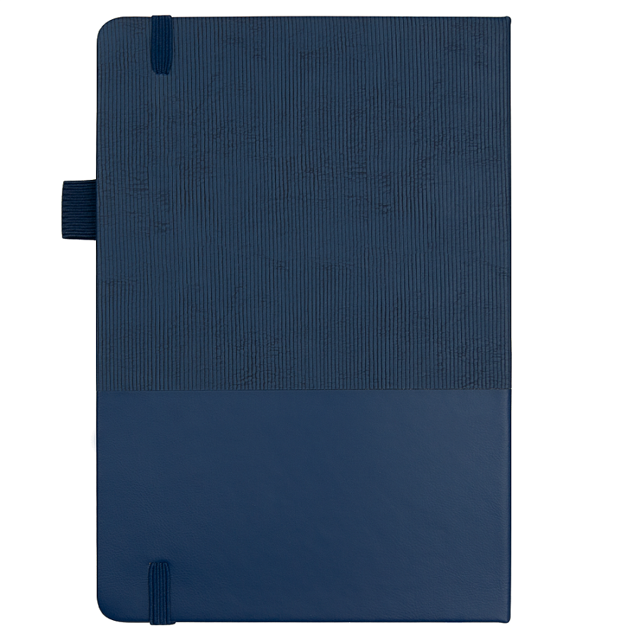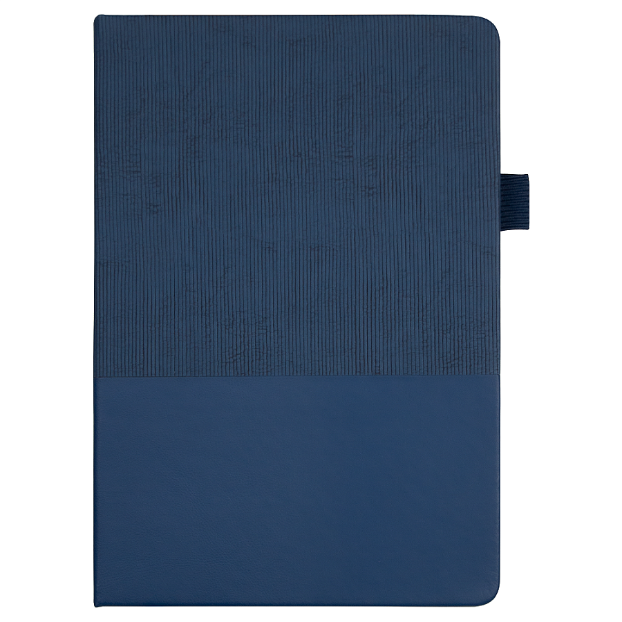 Стильный блокнот в твёрдой обложке с текстурированной верхней частью и гладким нижним сегментом. Оснащён вертикальной резинкой для фиксации и петлёй для ручки — всё под рукой.