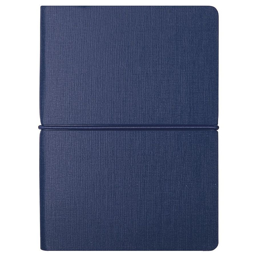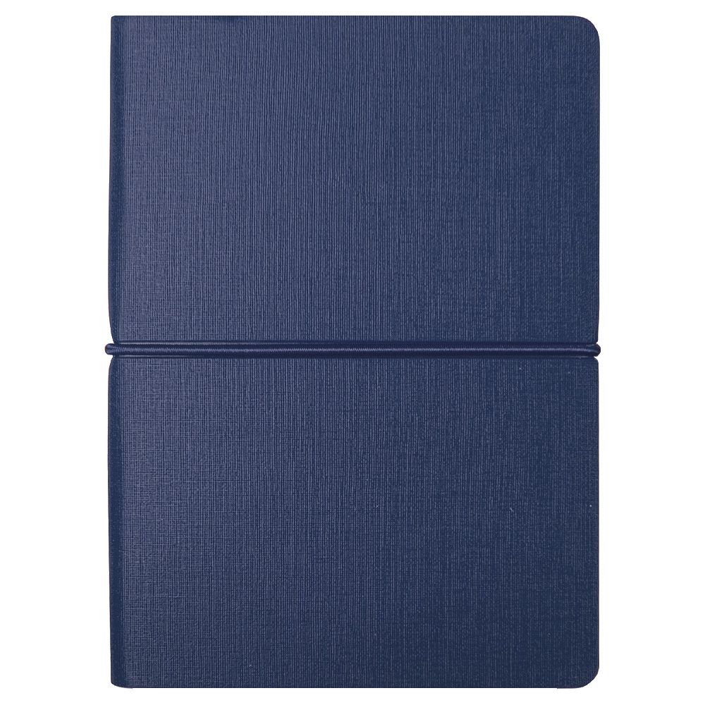 Гибкая обложка с текстурой ткани, горизонтальная резинка-фиксатор и закладка-лента. Внутри — страницы в линейку и набор цветных стикеров для заметок, маркировки и планирования.