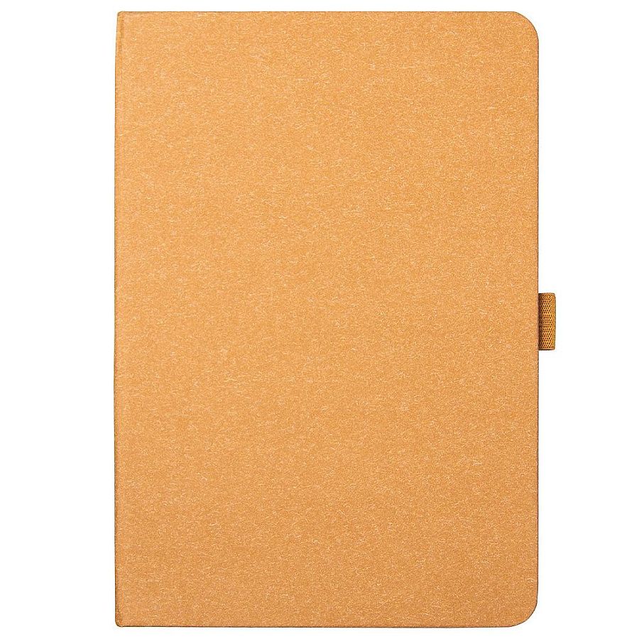 Твердая обложка выполнена из переработанной бумаги с характерной фактурой: матовая, слегка шероховатая поверхность с едва заметными вкраплениями волокон создает ощущение натуральности и тепла, напоминая ручную бумагу премиум-класса. Такой материал не только подчеркивает заботу об окружающей среде, но и придает блокноту уникальный винтажный шарм.