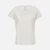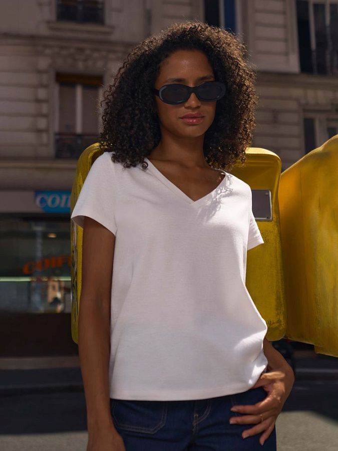 Женская футболка Regent с V-образным вырезом. Такой вырез снова актуален: он визуально удлиняет шею, подчеркивает линию ключиц и добавляет образу легкости.